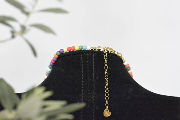 Diese hübsche Halskette wird aus bunten Steinperlen und kleinen vergoldeten Edelstahlperlen hergestellt. Die Vergoldung bleibt durch eine Ionenplattierung auch beim Kontakt mit Wasser bestehen.