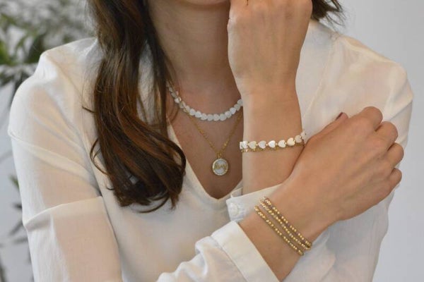 Dieses hübsche, filigrane Armkettchen wird aus Perlmuttherzen und kleinen goldenen Edelstahlperlen hergestellt. Die Vergoldung wurde durch eine Ionenplattierung aufgebracht, deshalb behalten die Perlen Ihre schöne, schimmernde goldene Farbe.