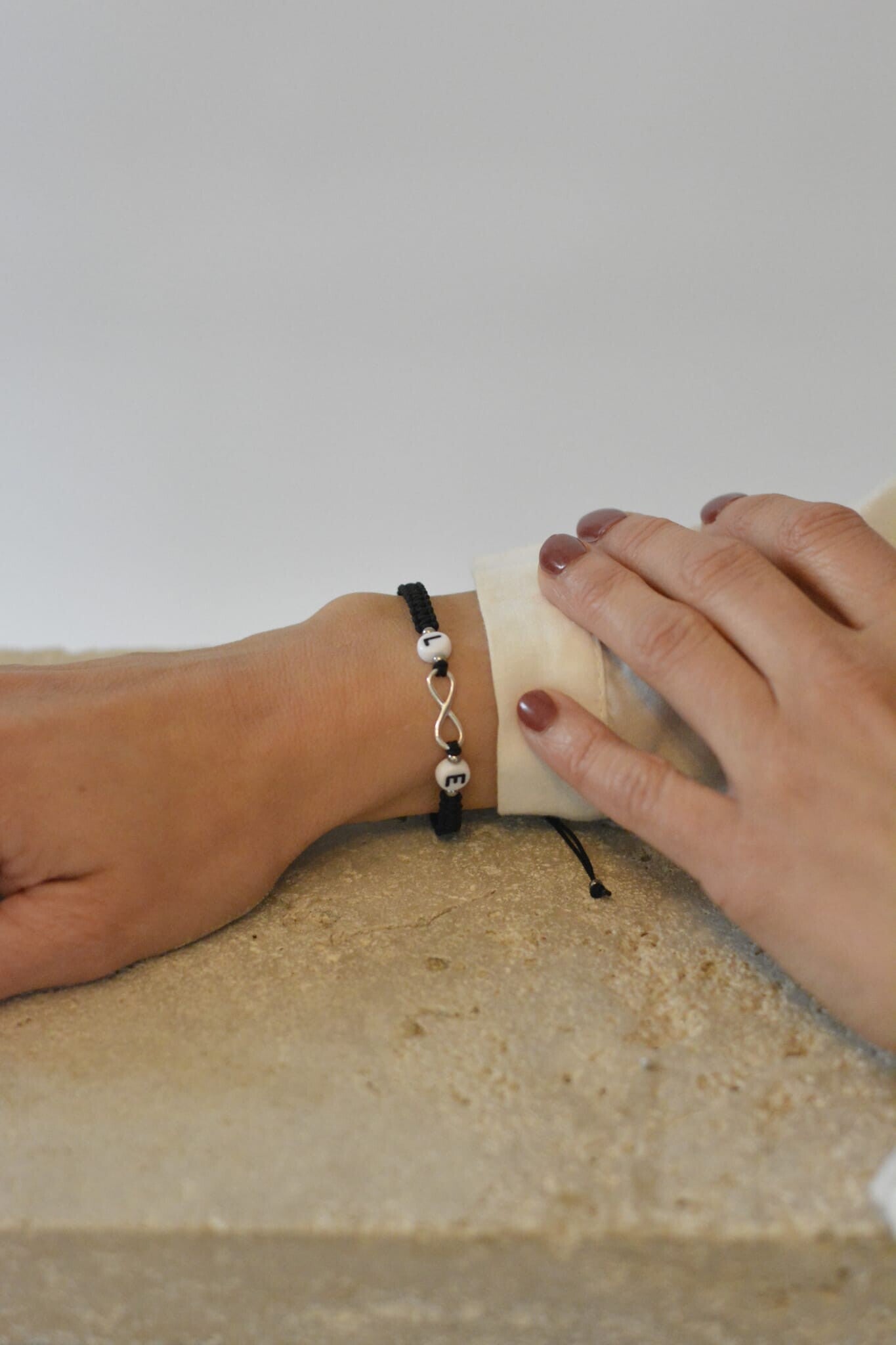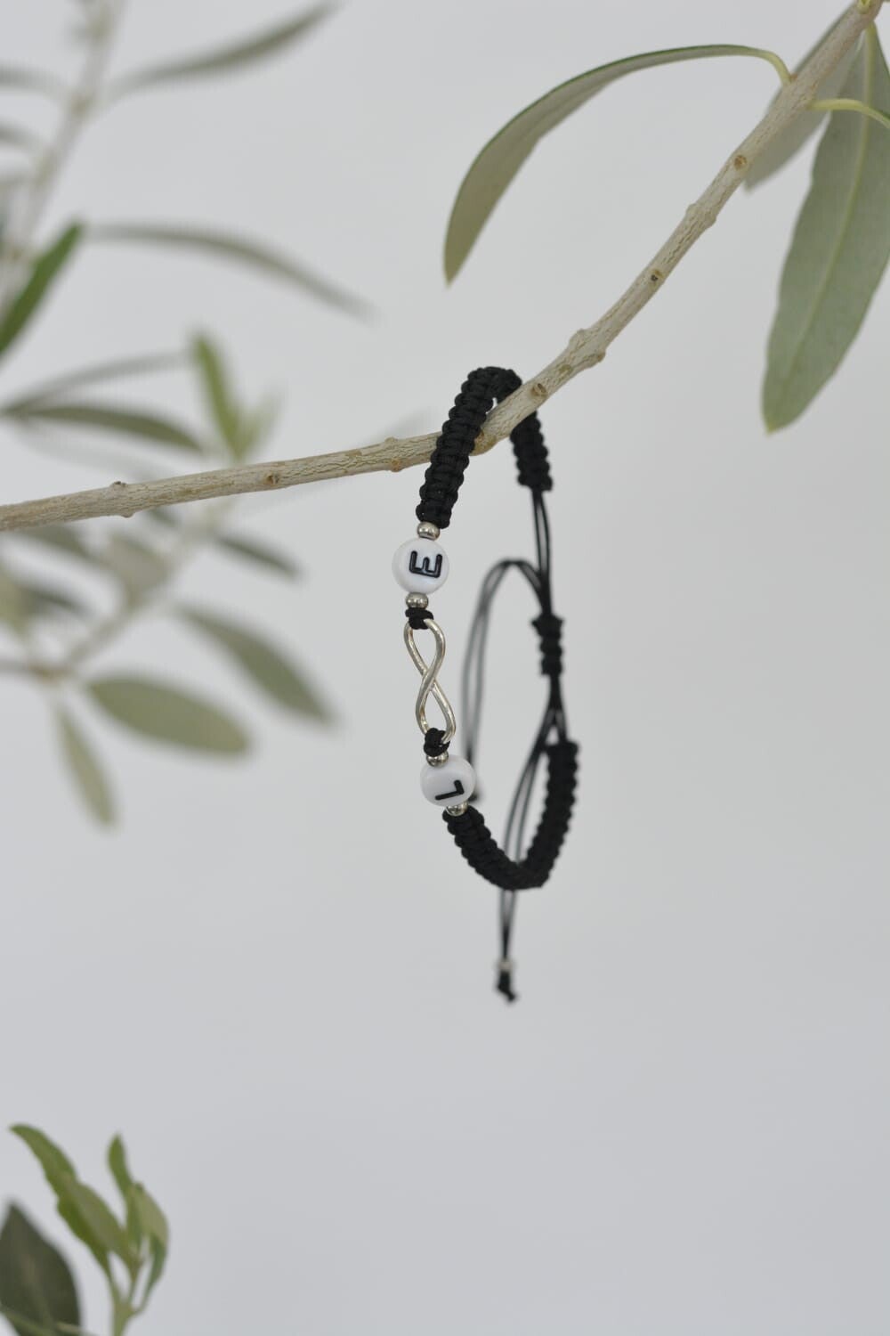 Das Infinity-Zeichen ist aus 925er silber und die Perlen aus rostfreiem Edelstahl. Die Buchstabenperlen sind aus Kunststoff.