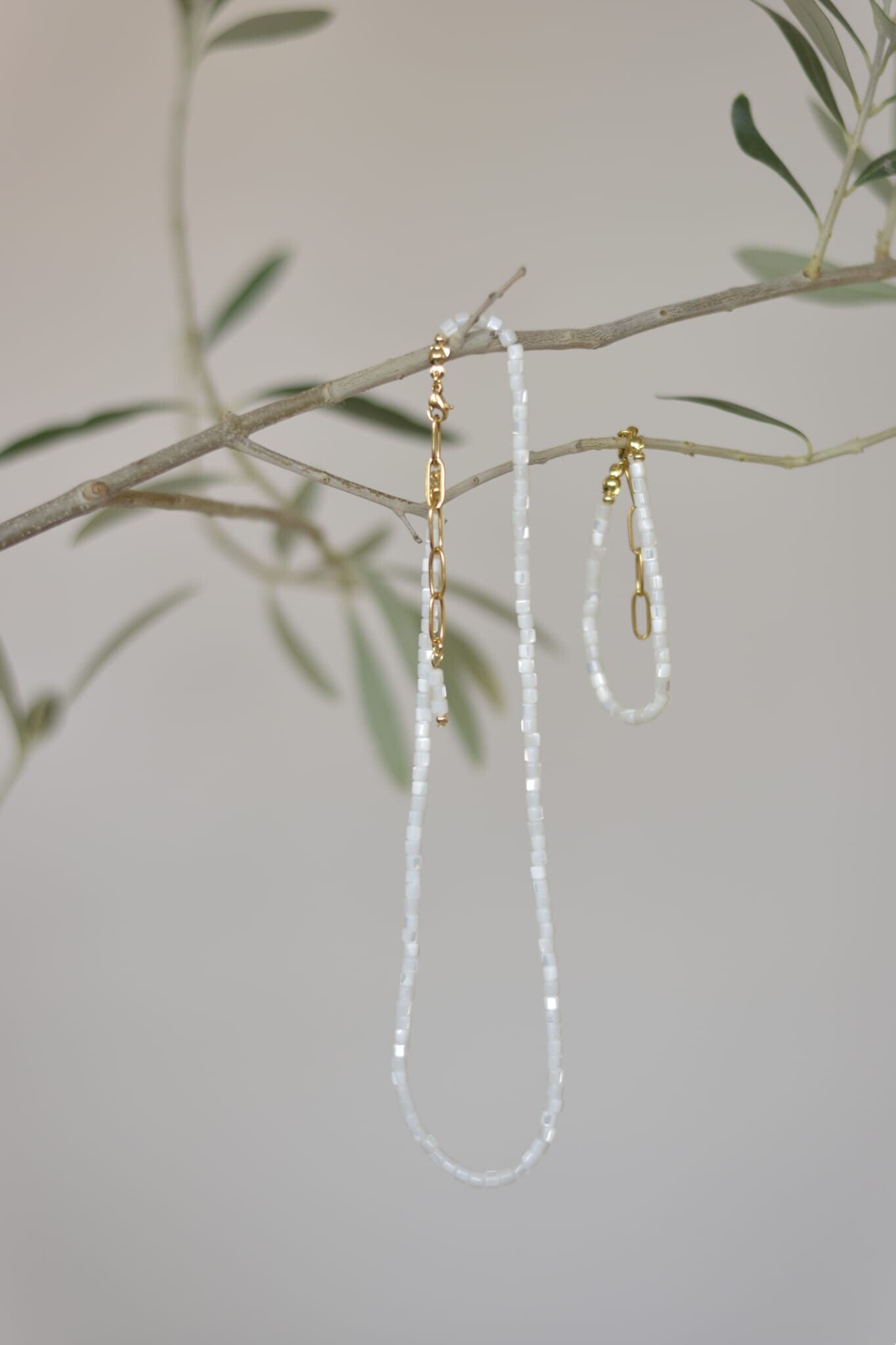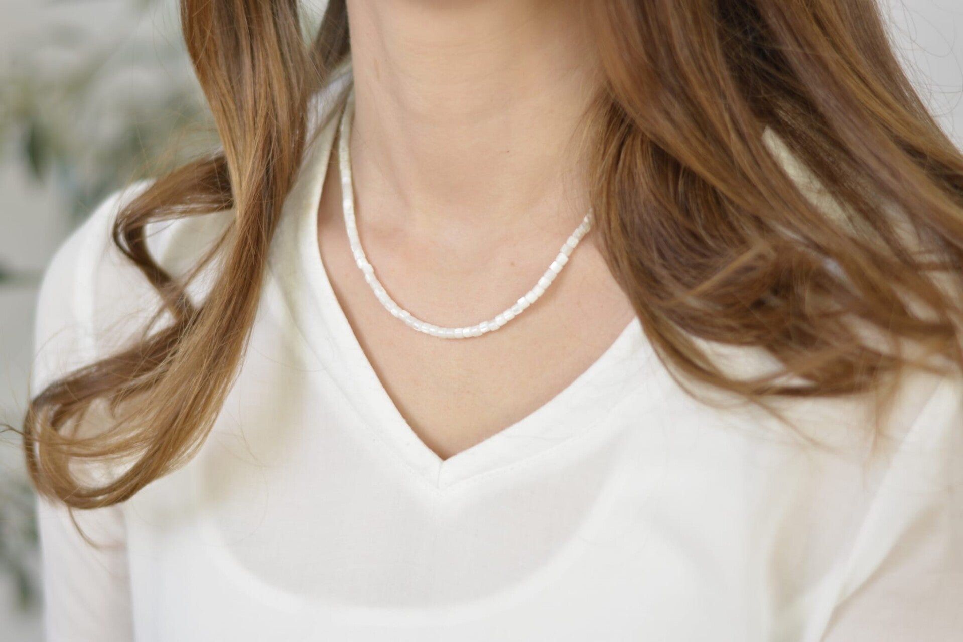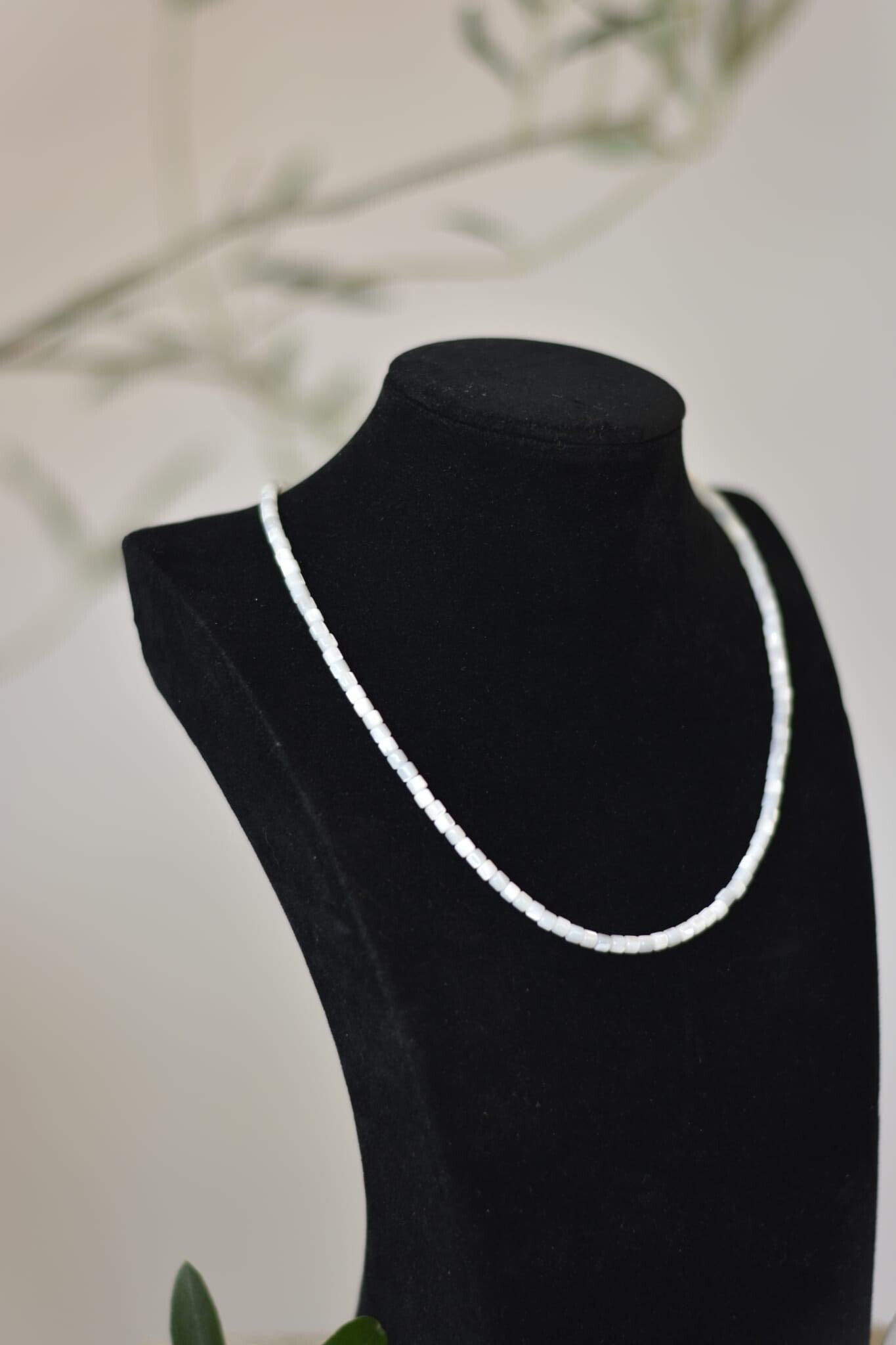 Halskette aus schönen, schimmernden Zylinderperlen. In weiß und mit einem modernen Verschluss aus Büroklammerketten und einem Anhänger aus Perlen.