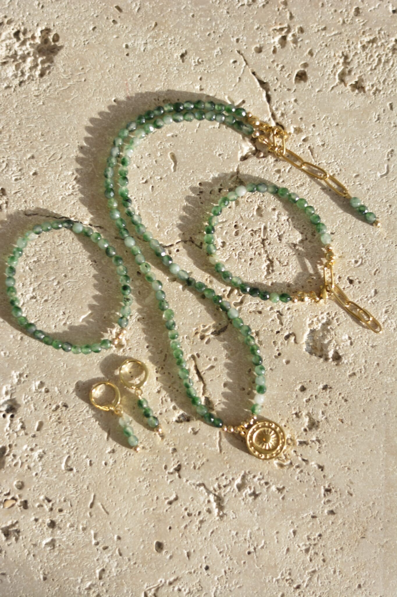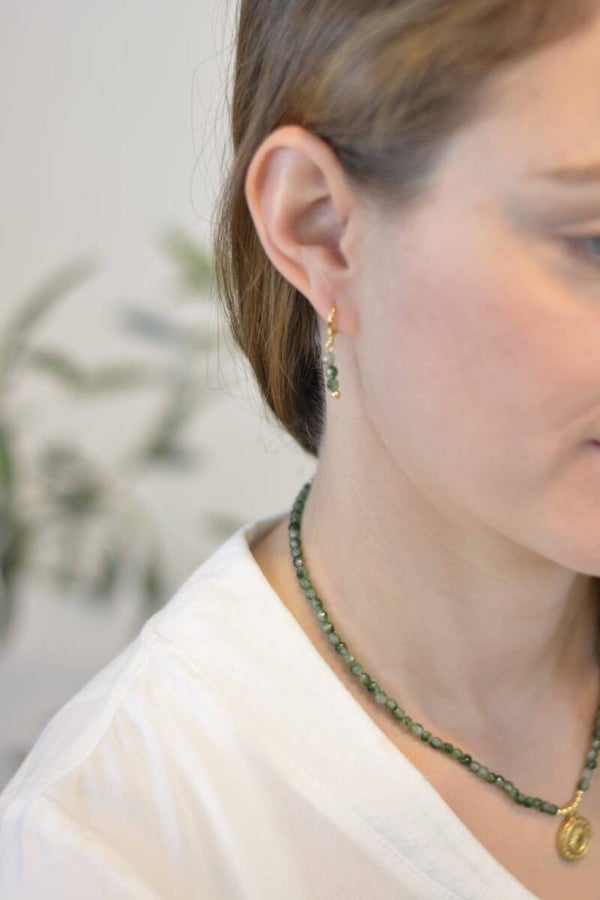 Diese hübsche Halskette ist aus grünen Chalcedony Perlen gefertigt. In Kombination mit dem goldenen Anhänger ist dies sehr edel und passt perfekt zu jedem Outfit.