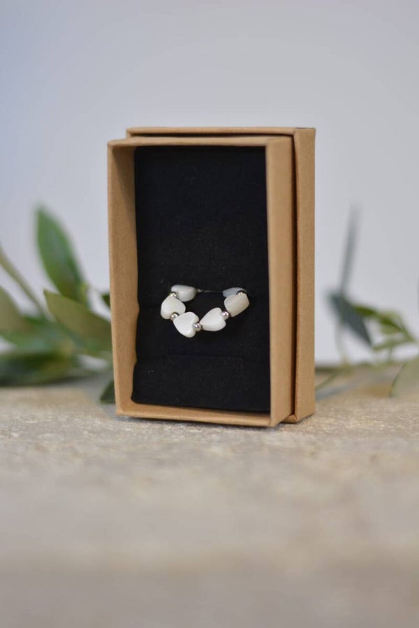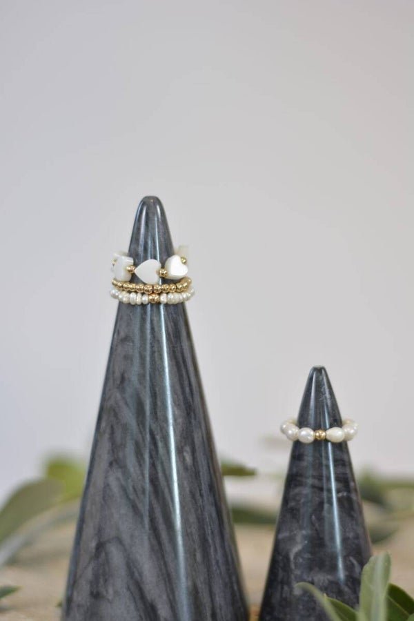 So einen schönen Ring aus kleinen Perlmuttherzen und goldenen Steinperlen.