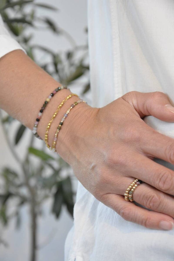 Diese zwei Varianten bestehen aus kleinen facettierten Turmalinperlen und vergoldeten Steinperlen.
