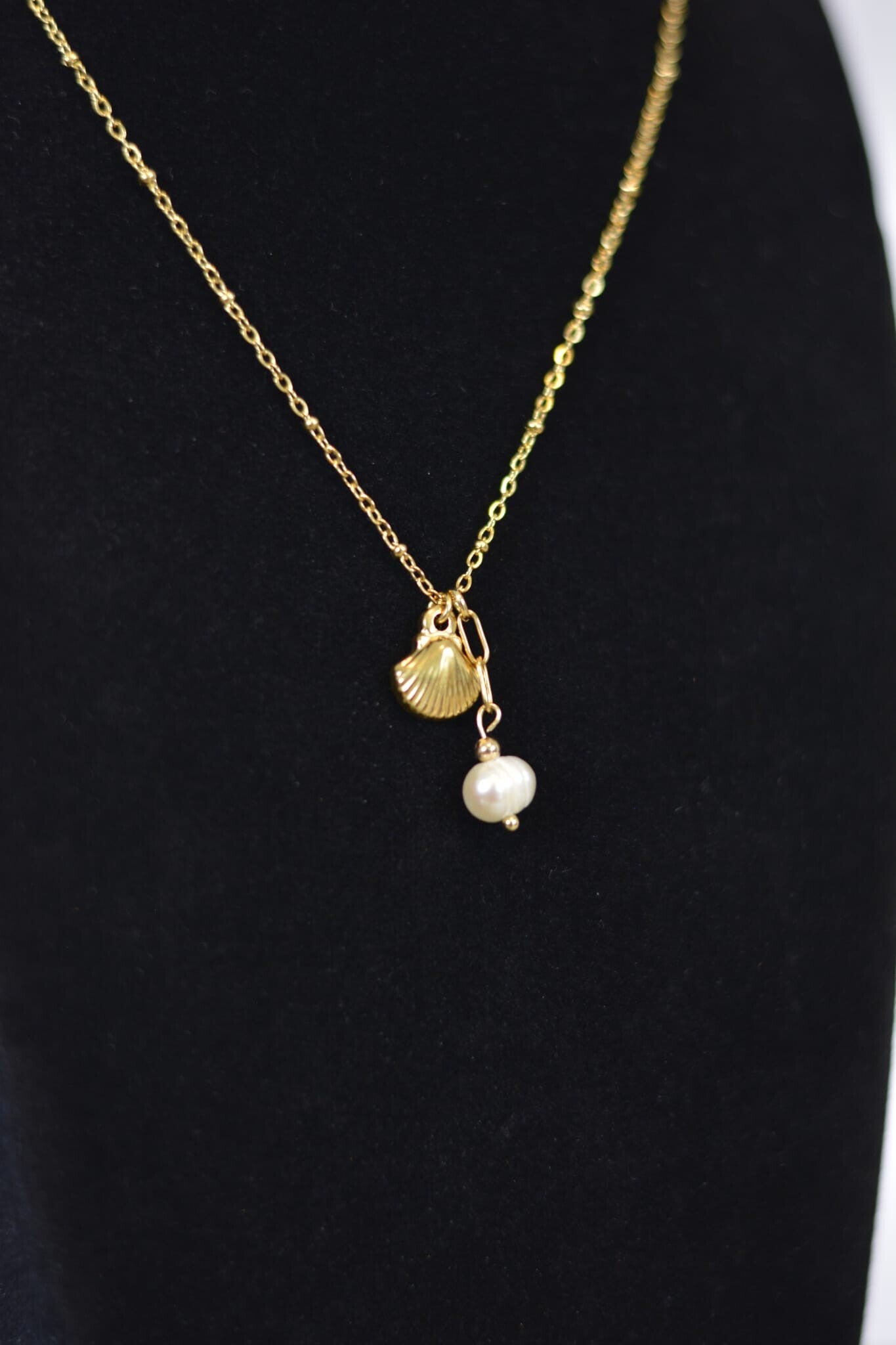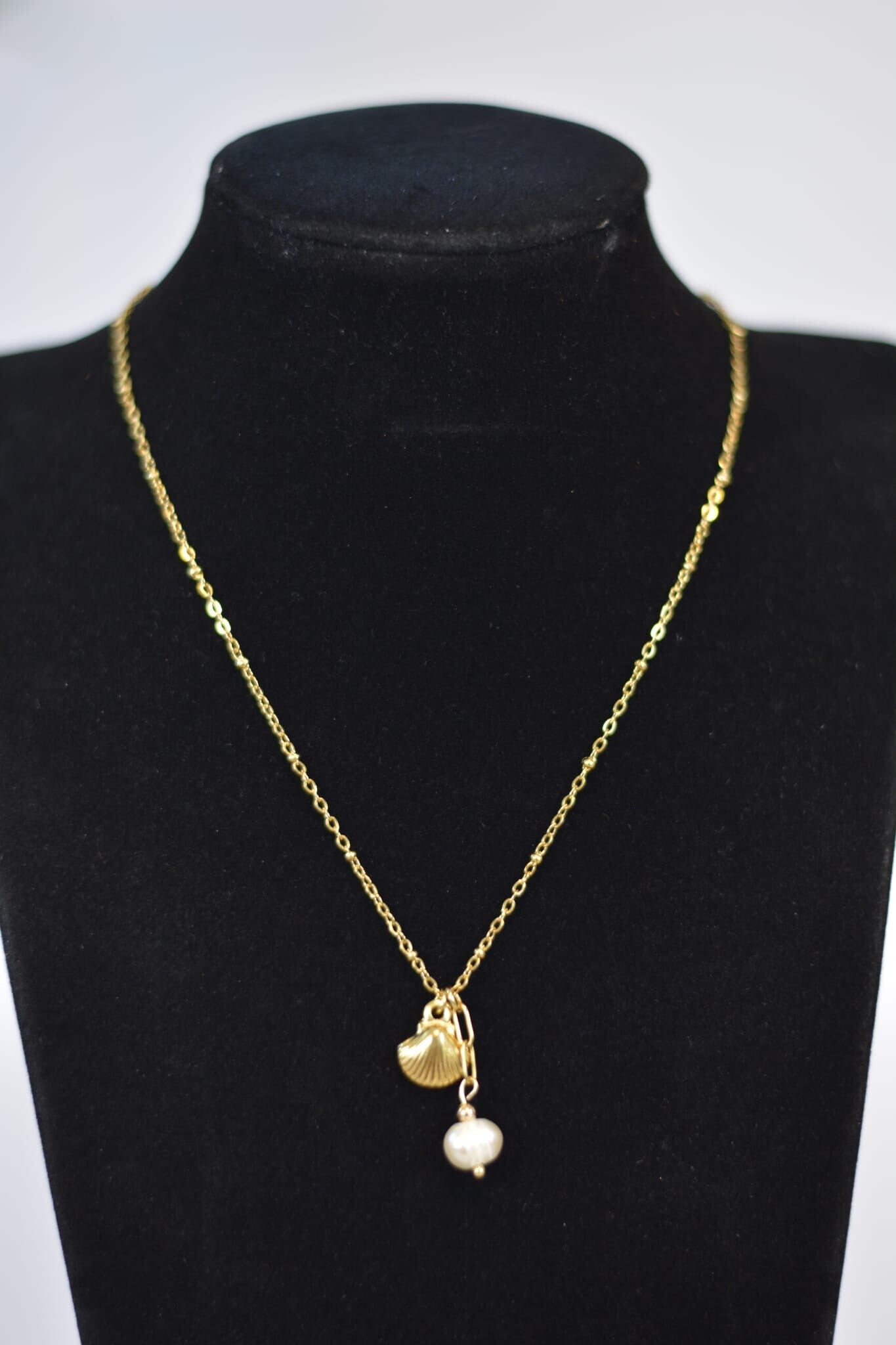 Diese Gliederkette ist aus robustem, langlebigen Edelstahl. Als Anhänger wurde eine kleine Muschel und eine Süßwasserperle verarbeitet.