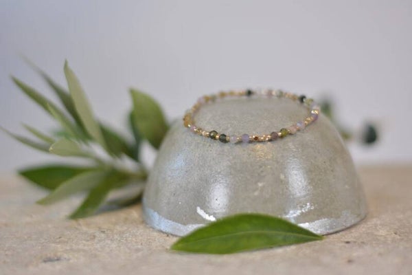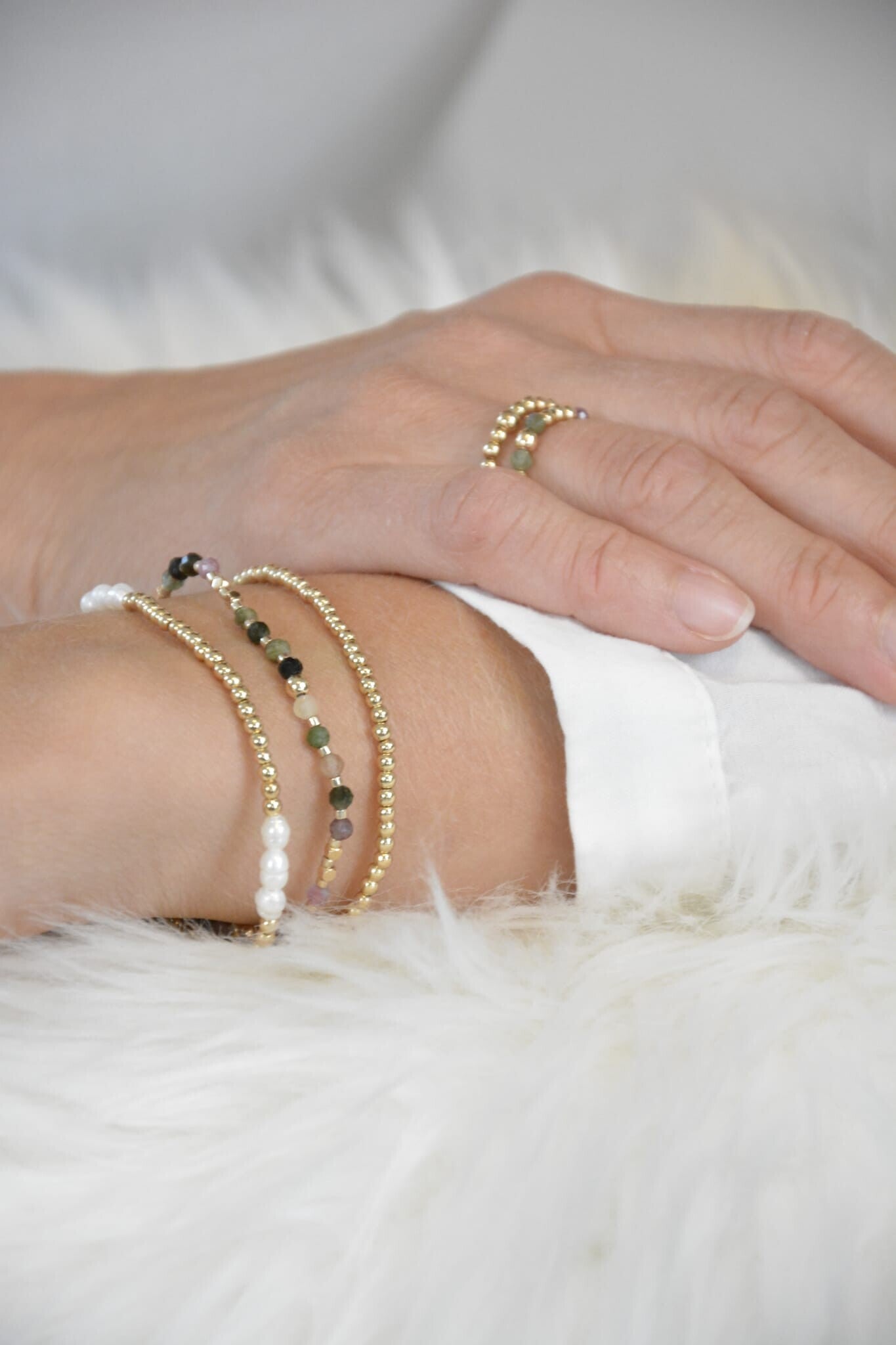 Die Armbänder bestehen teilweise aus facettierten Turmalinperlen, Süßwasserperlen und vergoldeten Edelstahlperlen. Die kleinen goldenen Perlen sind aus vergoldeten Steinperlen.