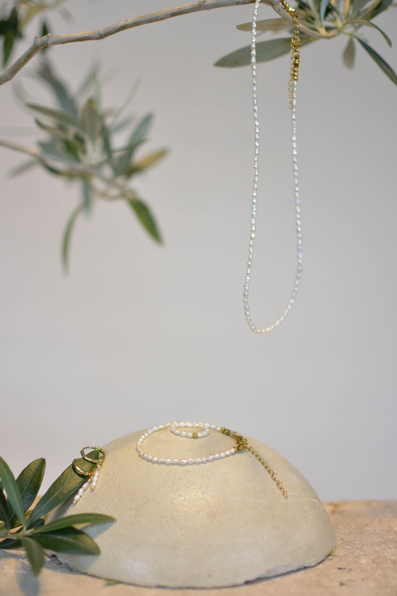 Diese Armkette besteht aus kleinen, zarten, länglichen Süßwasserperlen die ca. 3-4 mm lang sind.