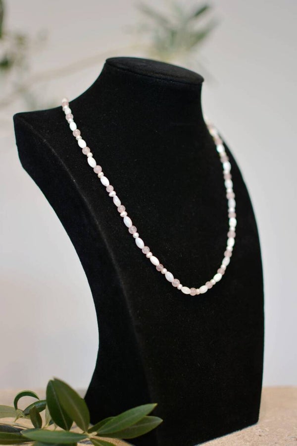 Schönes Set aus Rosenquarzperlen, Perlmuttperlen und echten Süßwasserperlen.