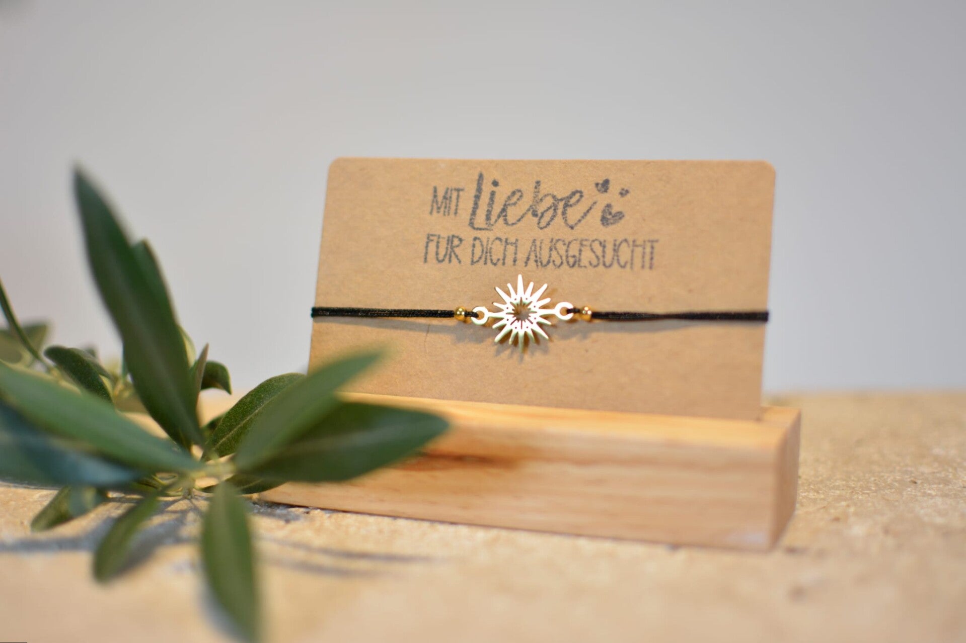 Das Armband kann auch auf die Geschenkkarten Mama, Freunde, Familie und Glück verpackt werden. Diese Karte wird mit einem Holzhalter geschickt, damit die Karte später noch als Deko verwendet werden kann.