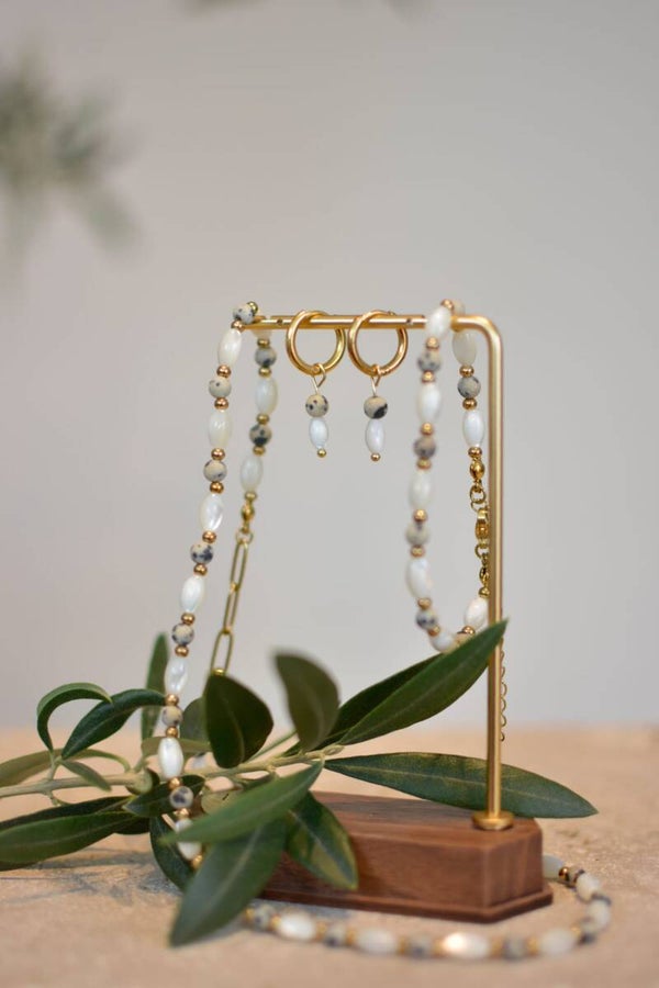 Diese schönen Ohrringe kombinieren eine Tigeraugenperlen mit einer weißen Perlmuttperlen.