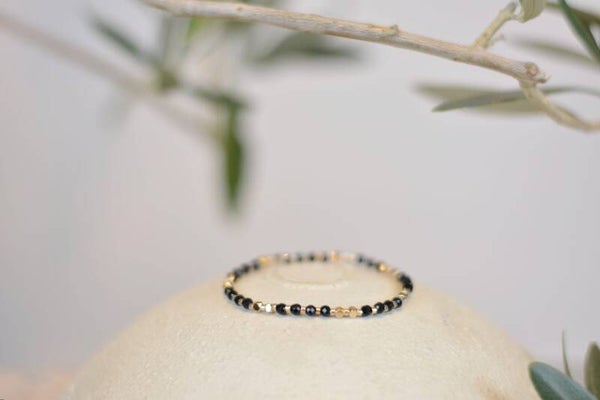 Die Armbänder bestehen aus wasserfesten vergoldeten Edelstahlperlen und facettierten Turmalinperlen.